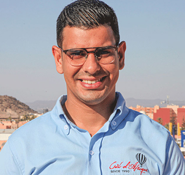Ayoub est le commercial terrain de Ciel d'Afrique, il représente notre société à l'extérieur sur les salons professionnels. Il forme les ambassadeurs de Ciel d'Afrique dans les hôtels et les Agences, et diffuse nos brochures et nos présentations auprès des Hôtels, Riads, Agences respectives etc...